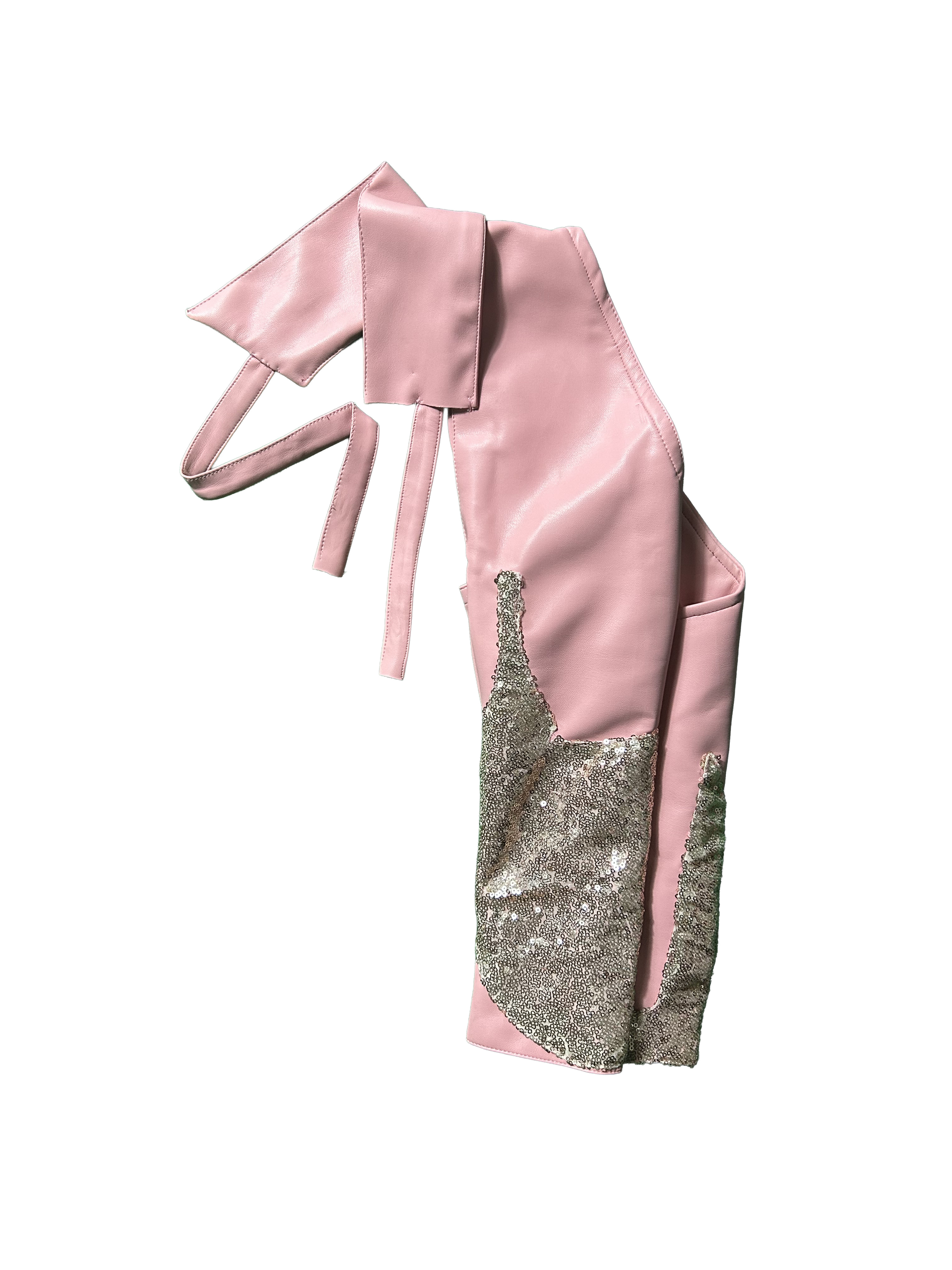 Saddle up in style with these handmade Cowgirl Chaps, crafted from eye-catching pink pleather adorned with shimmering sequin details. Perfect for the fashion-forward pup, these chaps blend Western flair with contemporary dog fashion. The durable pleather construction ensures lasting wear through fall adventures, while intricate macrame accents add artisanal charm. Whether your furry friend is hitting the ranch or turning heads at the dog park, these statement pieces deliver authentic cowgirl attitude with a playful twist.