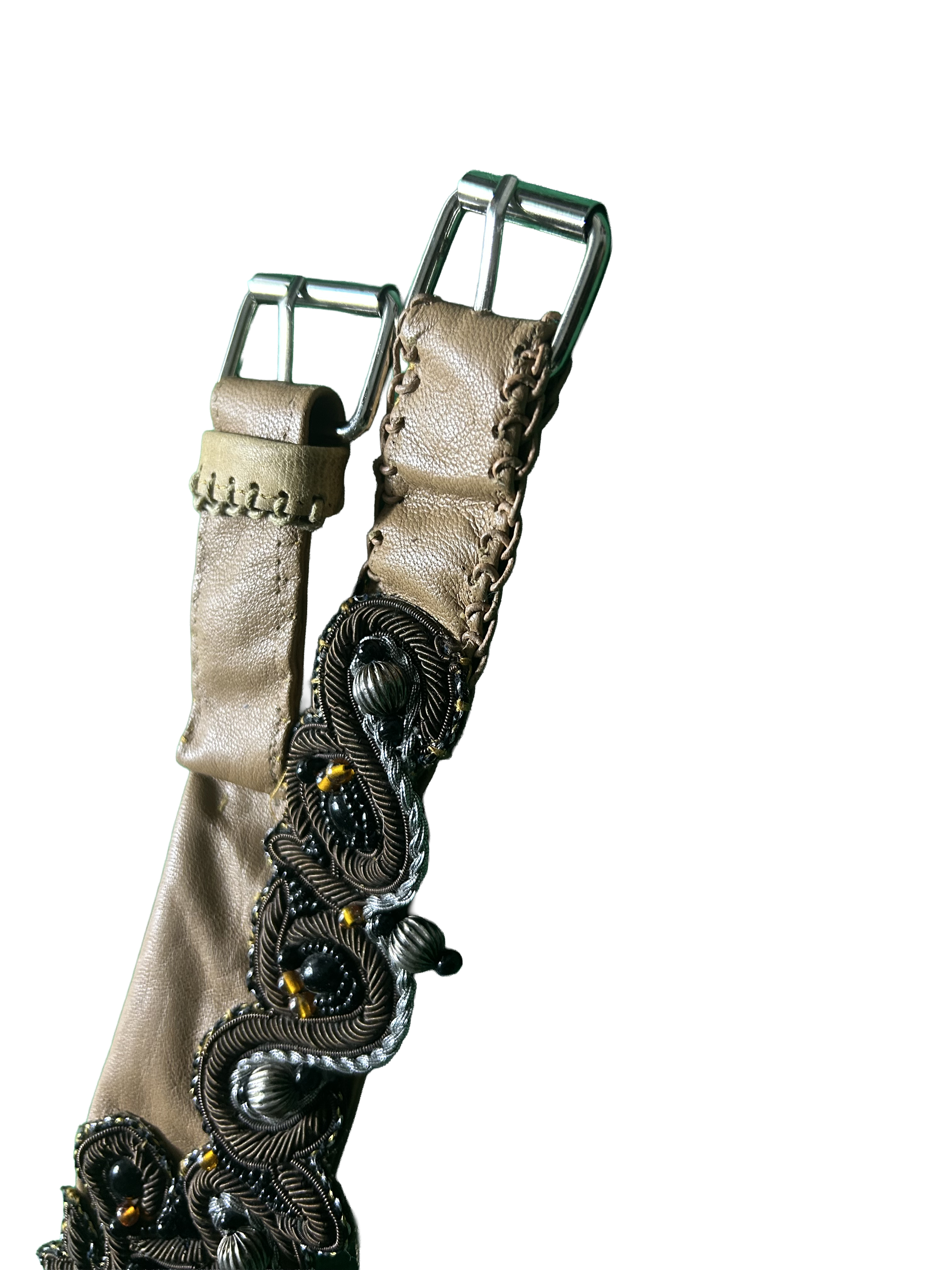 Royal Cowrie Choker This one-of-a-kind handmade choker features supple lambskin crafted with meticulous attention to detail. The piece showcases a striking cowrie shell accent that commands attention while maintaining an understated elegance. Each element is carefully selected and assembled by hand, ensuring no two pieces are identical. The luxurious lambskin drapes gracefully against the skin, offering both comfort and sophistication. A statement accessory for those who appreciate artisanal craftsmanship and distinctive fashion pieces that reflect individual style.